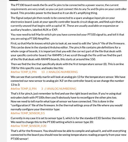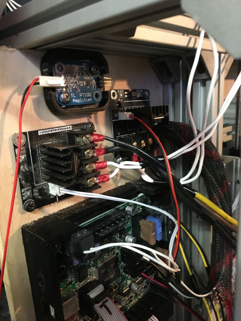 I was able to identify an analog input on the archum controi board. After 5 hours into the night and 4 hours this morning trying to get arduino IDE or visual studio to compile a marlin file I gave up. I ordered a DUET 2 WIFI control board. This decision was based on the provided firmware for the project is Repietier build and it would not configure for the archim, in fact i couldn't get a build for another ultimachine rambo to work either. The archim has a version of marlin on their wiki page that works and configures for core xy so the machine is operating and if i can get the pt100 board to talk to it i will be moving forward, It's just the acknowledgment that even though the arcmin board is 32 bit it is old and unsupported, my thoughts are ardruino for shops will be replaced with Duet systems. Did I mention I purchased a real Duet not a clone. The build continues, closing up the oven in progress