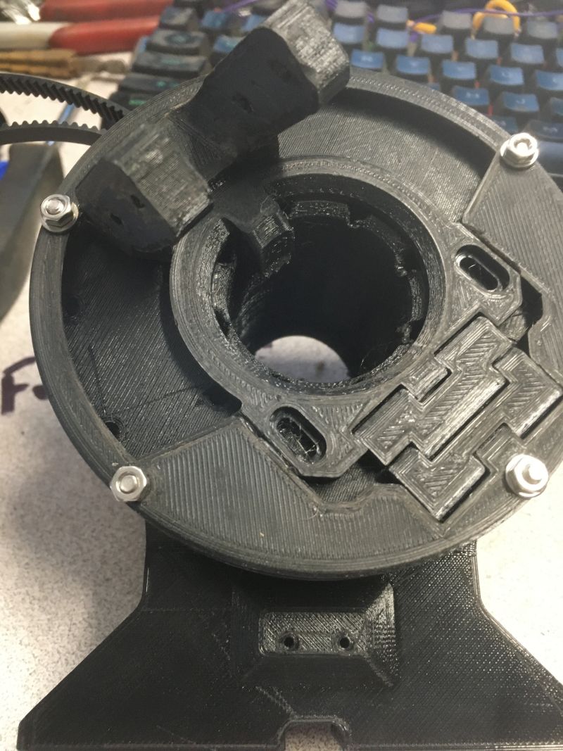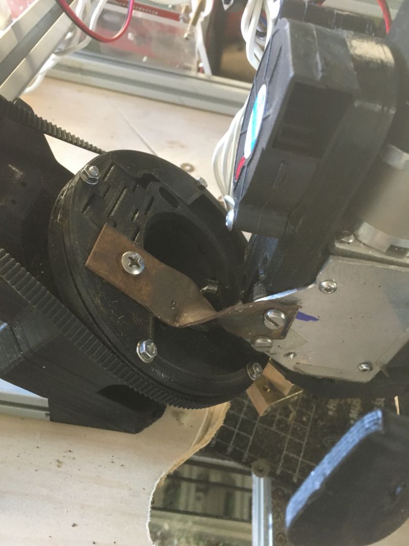 Second attempt at getting the print head mounted. This is ver2 in the plans for the rotory head. The first broke at the mount and attempts to fiberglass it failed. There just is not enough material on the base to support the nozzle weight