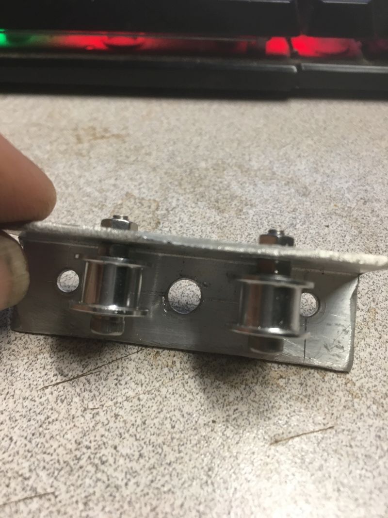 Looks like the quick fix is to re drill the angle bracket so the pullies can go in farther, this pulley setup has the jam nut configuration, the right setup would be countersunk screws on the back so the bracket can be flush without any obstruction or potential of hitting the transmission bracket