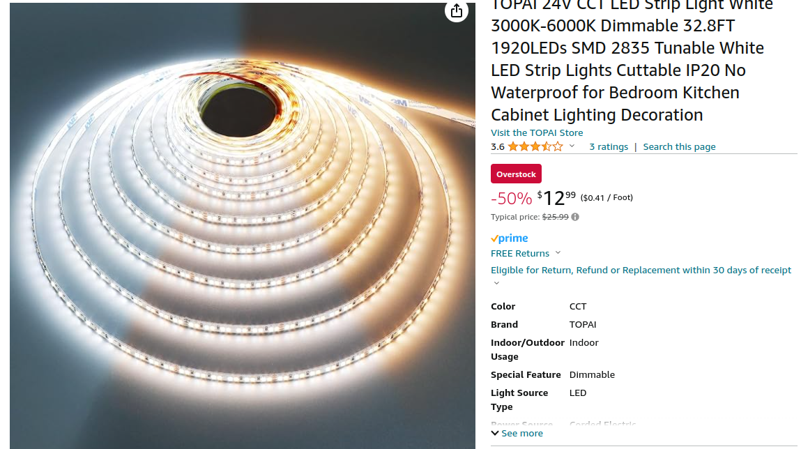 CCT Dimmable SMD2835 LED Strip Light has 24V constant voltage, 12V/5V power supply is not suitable for this product. 30-35 lumens per watt, 70 watts per 10 meters (6-7 watts per meter), 2100-2450 total lumens. The width of the strips is 8mm. Compatible with 24V 3A and above power adapter (the power adapter is not included in the package)