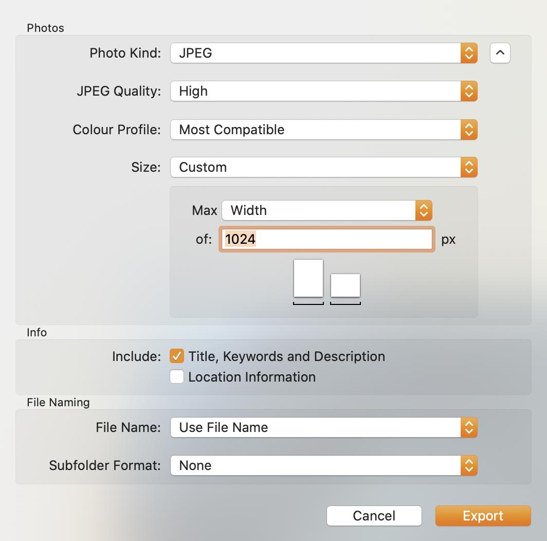 export, the option for compression are jpeg, start with the default setting and check the file size and image quality