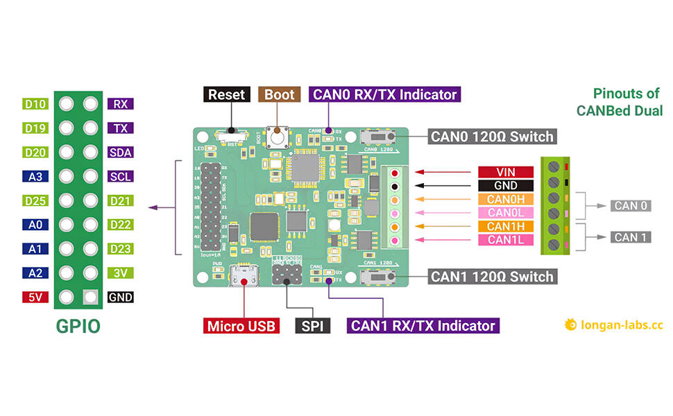 The Atmega32U4 chip on this board provides a wealth of pin resources. There are 18 pins based on the core chipset on the board, including digital pins, analog pins, UART, and I2C interface. Additionally, this CANBed uses the MCP2515 CAN Bus controller with SPI interface and MCP2551 to achieve CAN-Bus capability. There are also two types of CAN Bus interfaces available to meet various needs, a sub-D9 connector and a terminal block interface.