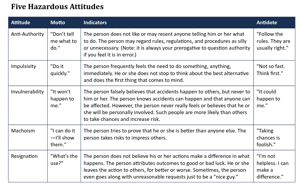 Studies have identified five hazardous attitudes that can interfere with the ability to make sound decisions and properly exercise authority.
